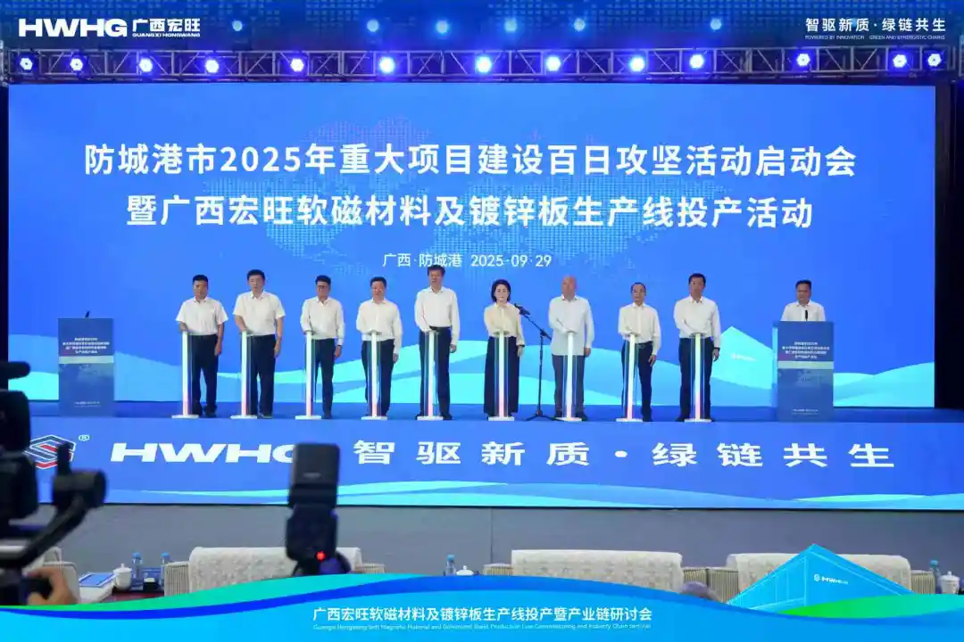9月29日,廣西宏旺軟磁材料及鍍鋅板生產(chǎn)線投產(chǎn)活動(dòng)隆重舉行。自治區(qū)黨委常委、自治區(qū)常務(wù)副主席許永錁出席活動(dòng),防城港市委書(shū)記黃江,市長(zhǎng)邱明宏,市政協(xié)主席梁宗勇,自治區(qū)地質(zhì)礦產(chǎn)勘查開(kāi)發(fā)局局長(zhǎng)、自治區(qū)實(shí)體經(jīng)濟(jì)服務(wù)員工作隊(duì)駐防城港市工作隊(duì)隊(duì)長(zhǎng)黎四龍,湖南省婁底市政協(xié)主席梁立堅(jiān),自治區(qū)發(fā)改委、工信廳、園區(qū)辦、防城港市四家班子及相關(guān)單位負(fù)責(zé)同志,行業(yè)協(xié)會(huì)專家、各金融機(jī)構(gòu)、各戰(zhàn)略合作單位,以及項(xiàng)目合作股東廣西盛隆冶金有限公司總經(jīng)理柯雪利、經(jīng)營(yíng)總裁林能鏡,宏旺控股集團(tuán)董事長(zhǎng)、總裁戴促輝,集團(tuán)副總裁朱繼喬、高志策、劉慧丹等領(lǐng)導(dǎo)嘉賓共同參與本次活動(dòng)。防城港市委常委、常務(wù)副市長(zhǎng)陶德文主持儀式。